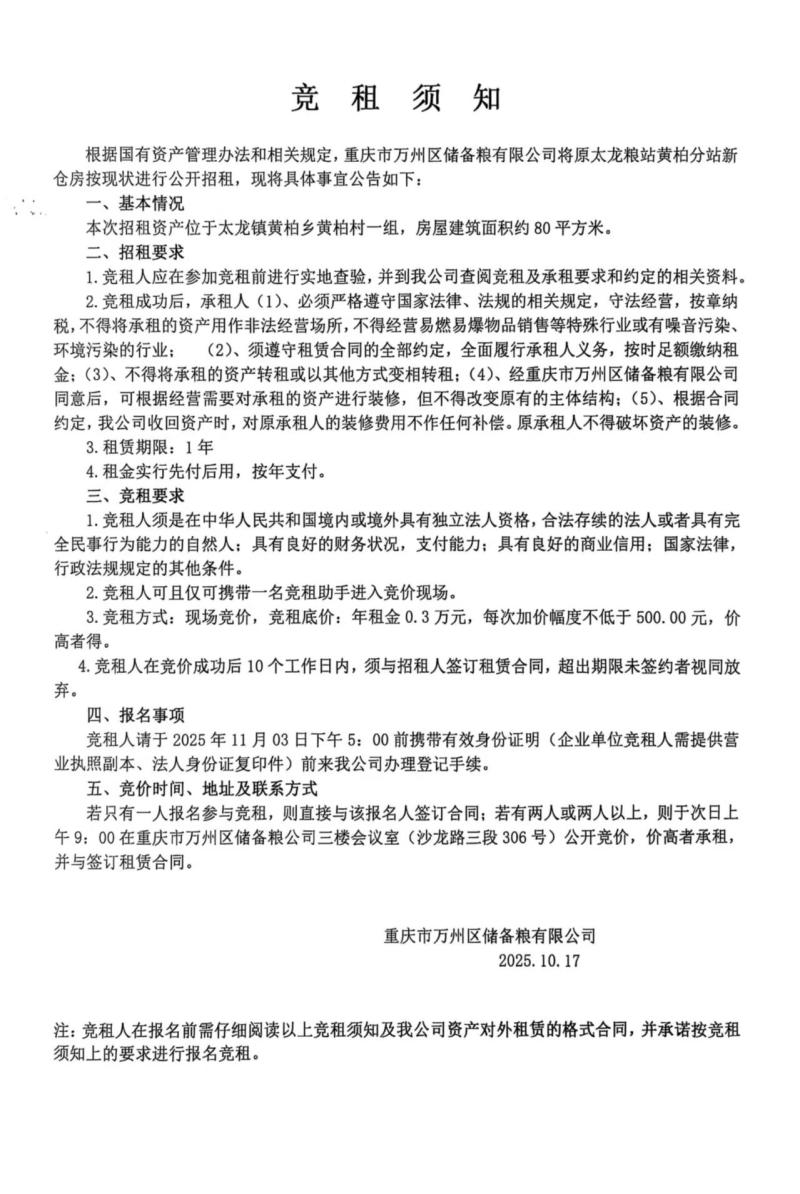 - 万州区储备粮有限公司原桥亭粮站后山分站招租