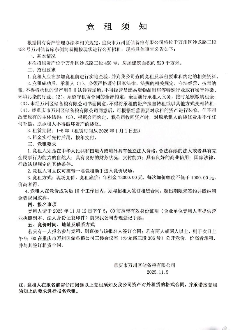 - 万州区储备粮有限公司双河口前排库房及库房前空地招租