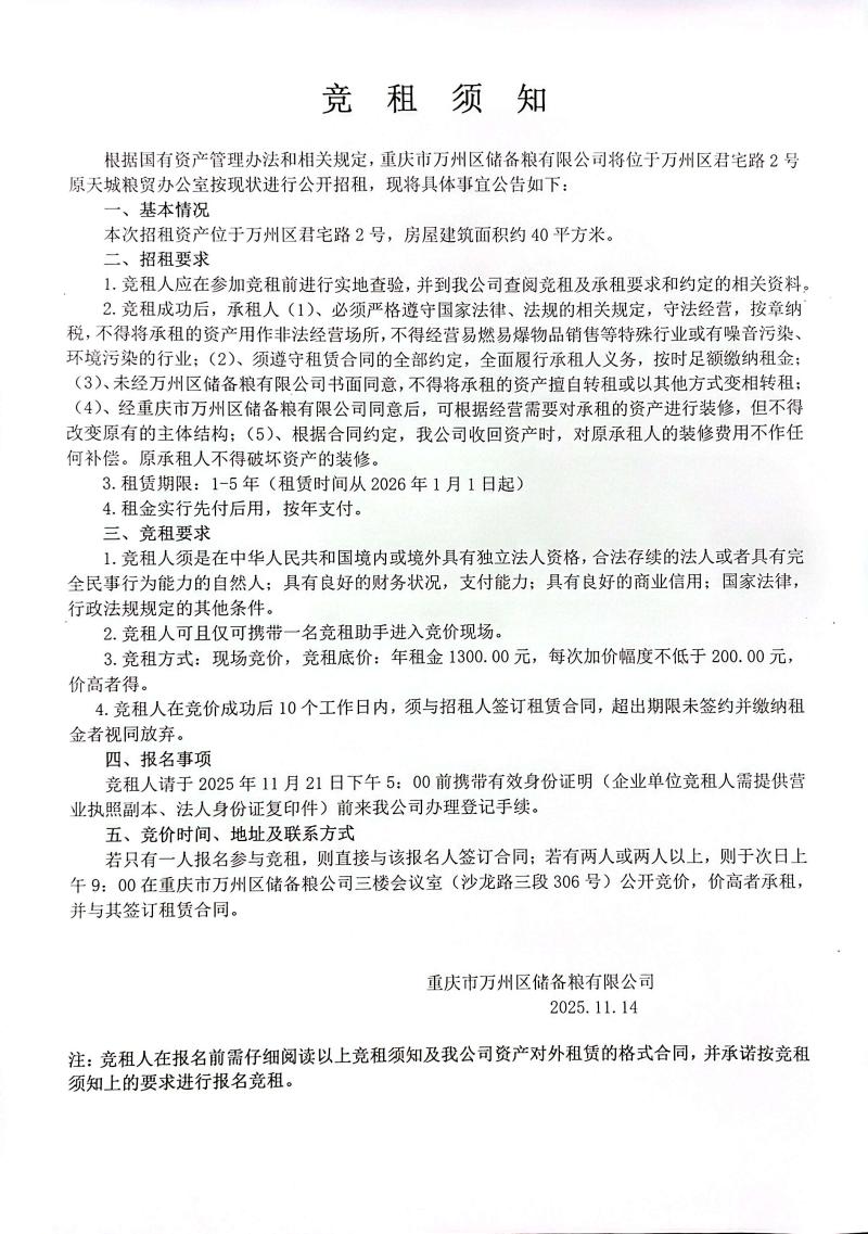 1.地址:万州区君宅路2号。2.房屋建筑面积约40平方米。3.年租金底价1300.00元。4.报名截止时间11月21日。未招租到顺延5个工作日,直至招租到承租人为止。