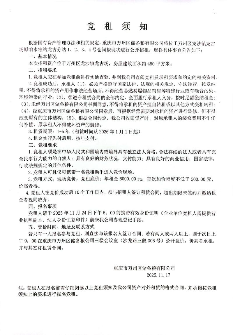 1.地址:万州区龙沙镇龙古场。2.房屋建筑面积约480平方米。3.年租金底价6000.00元。4.报名截止时间11月24日。未招租到顺延5个工作日,直至招租到承租人为止。