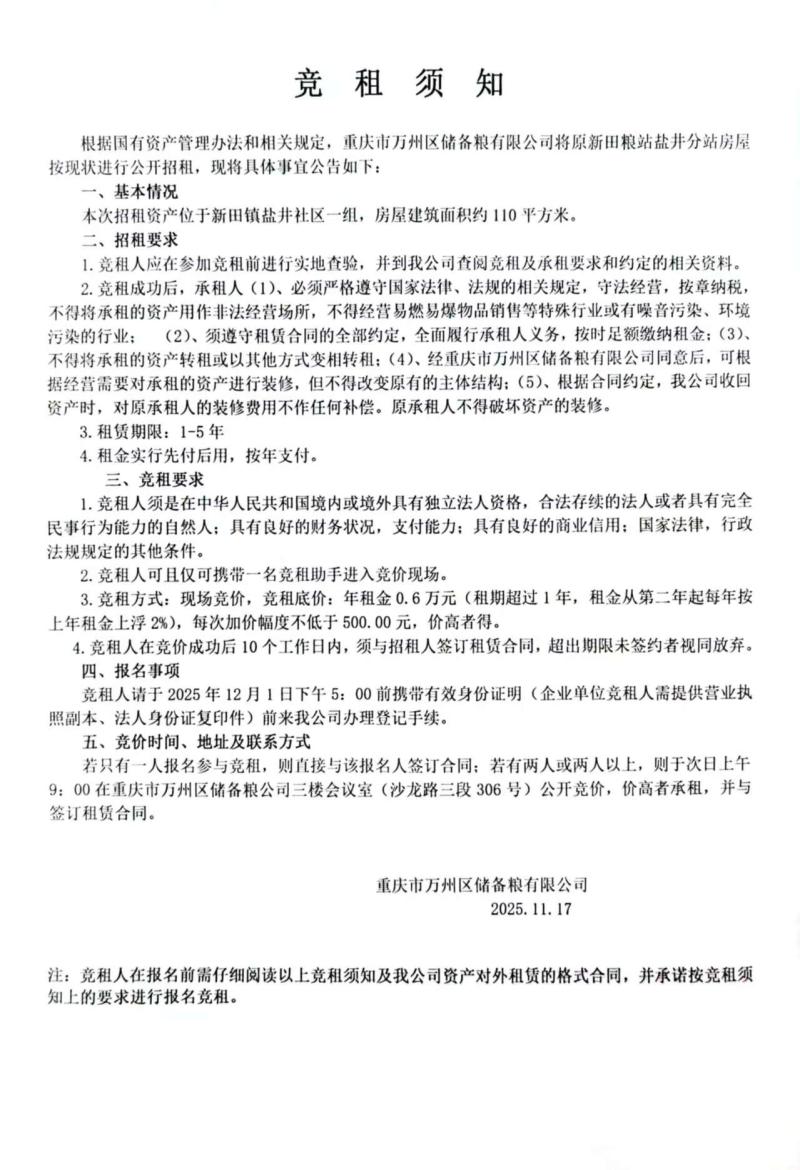 地址:万州区新田镇盐井社区1组 面积:约110㎡ 租赁期限:1-5年 招租底价:首年租金6000元,租期超过一年,从次年起按上年租金上浮2%。