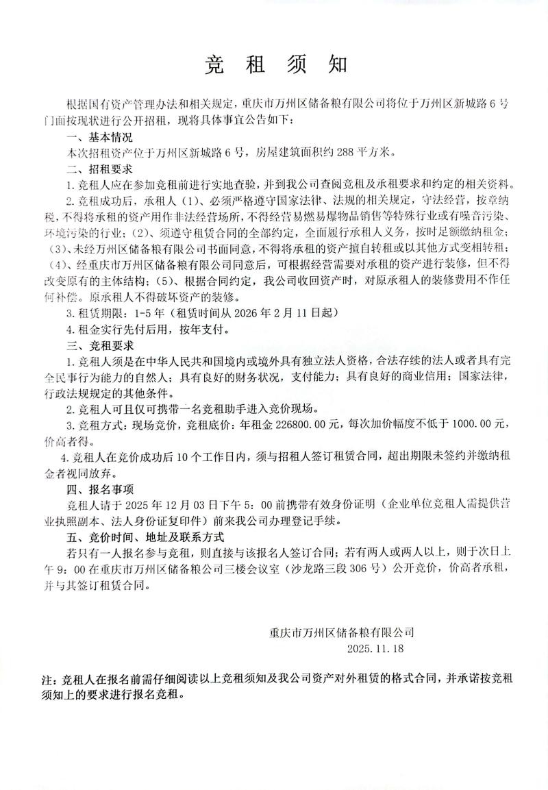 - 万州区储备粮有限公司原天城粮贸办公室招租