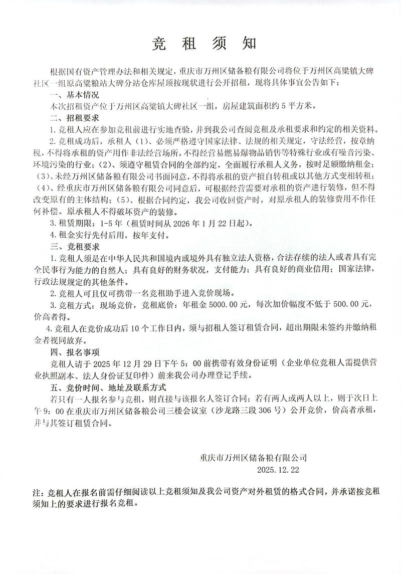 1.万州区高粱镇大碑社区一组。2.房屋建筑面积约5平方米。3.年租金底价5000.00元。4.报名截止时间12月29日。未招租到顺延5个工作日,直至招租到承租人为止。