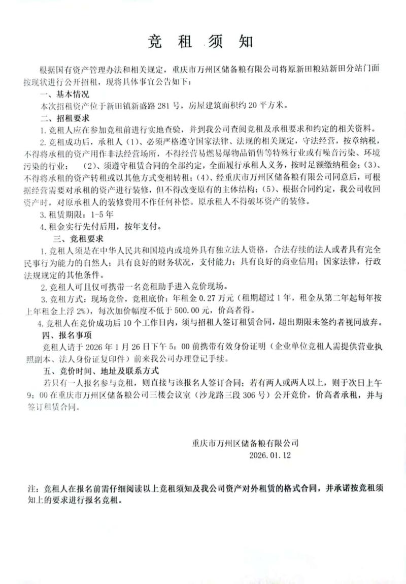 - 万州区储备粮有限公司原凉风粮站龙吟阁分站门面招租