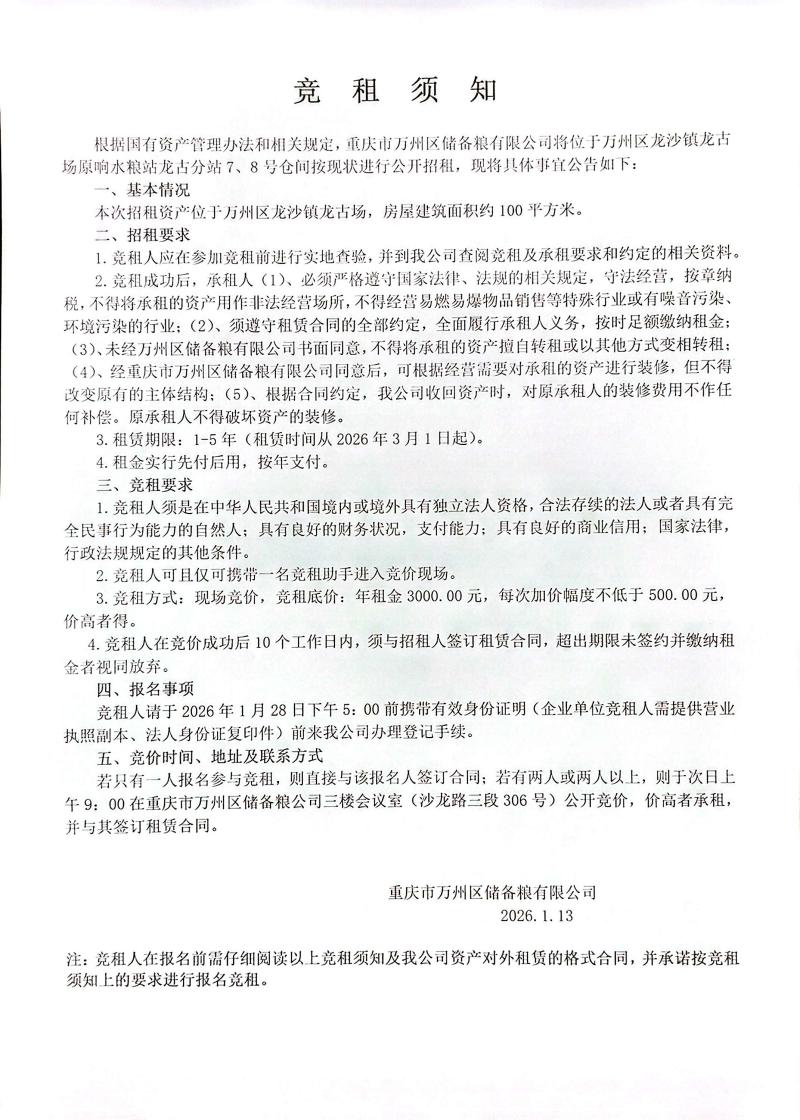 - 万州区储备粮有限公司原响水粮站龙古分站7、8号仓间招租