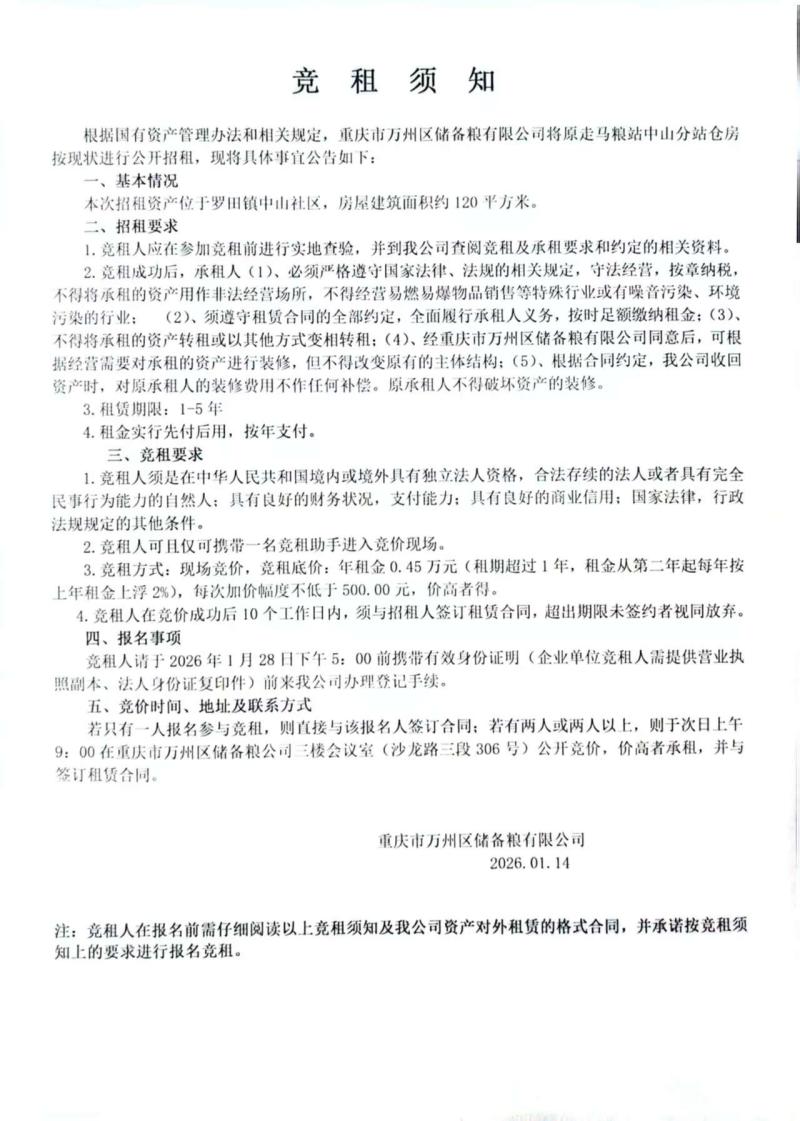 - 万州区储备粮有限公司原凉风粮站鹿山分站招租
