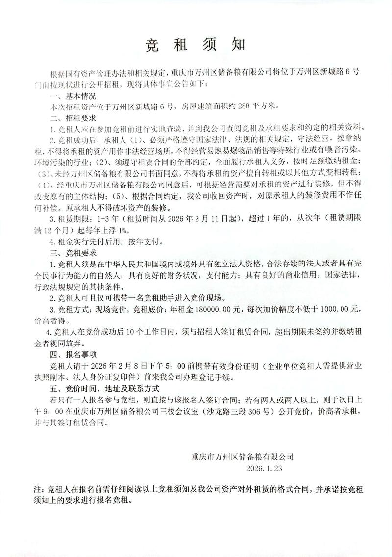 - 万州区储备粮有限公司原凉风粮站龙吟阁分站门面招租