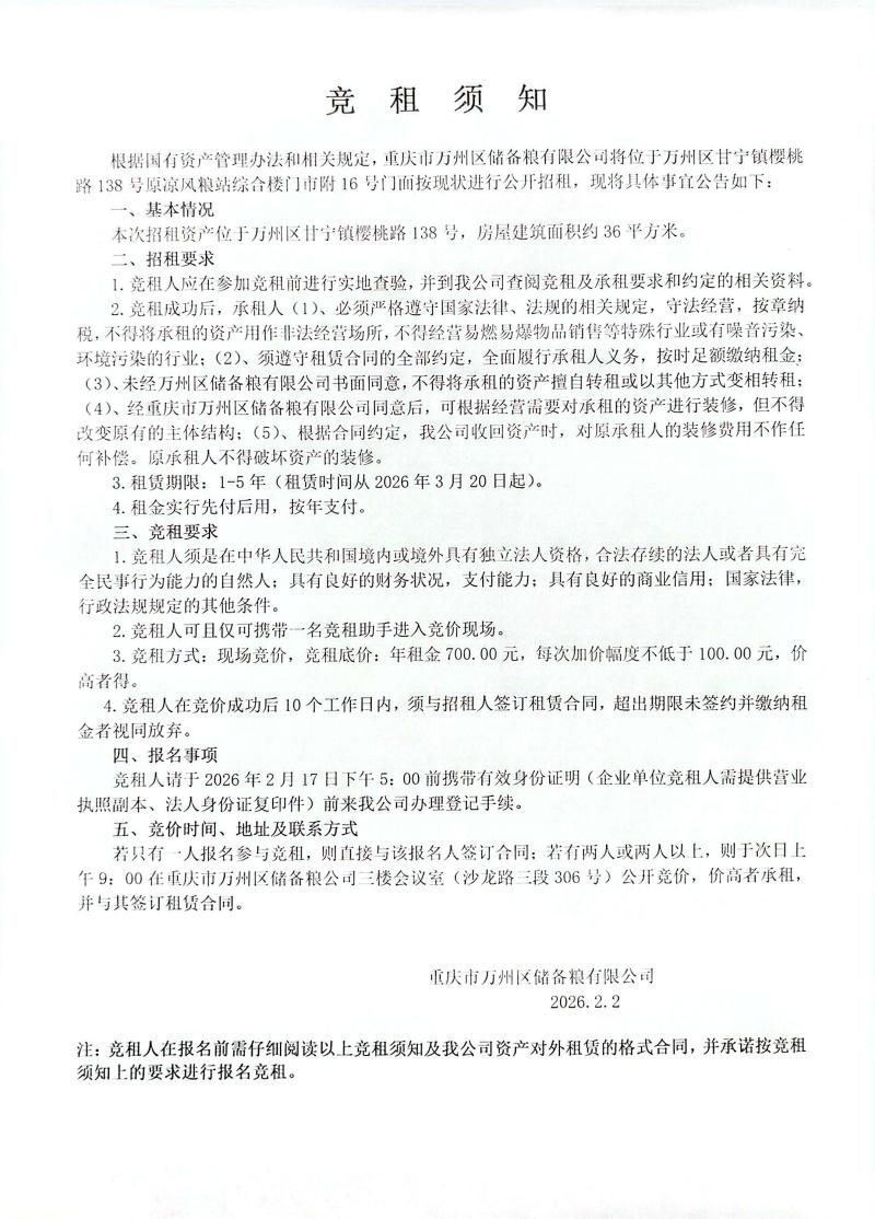 - 万州区储备粮有限公司原凉风粮站龙吟阁分站门面招租