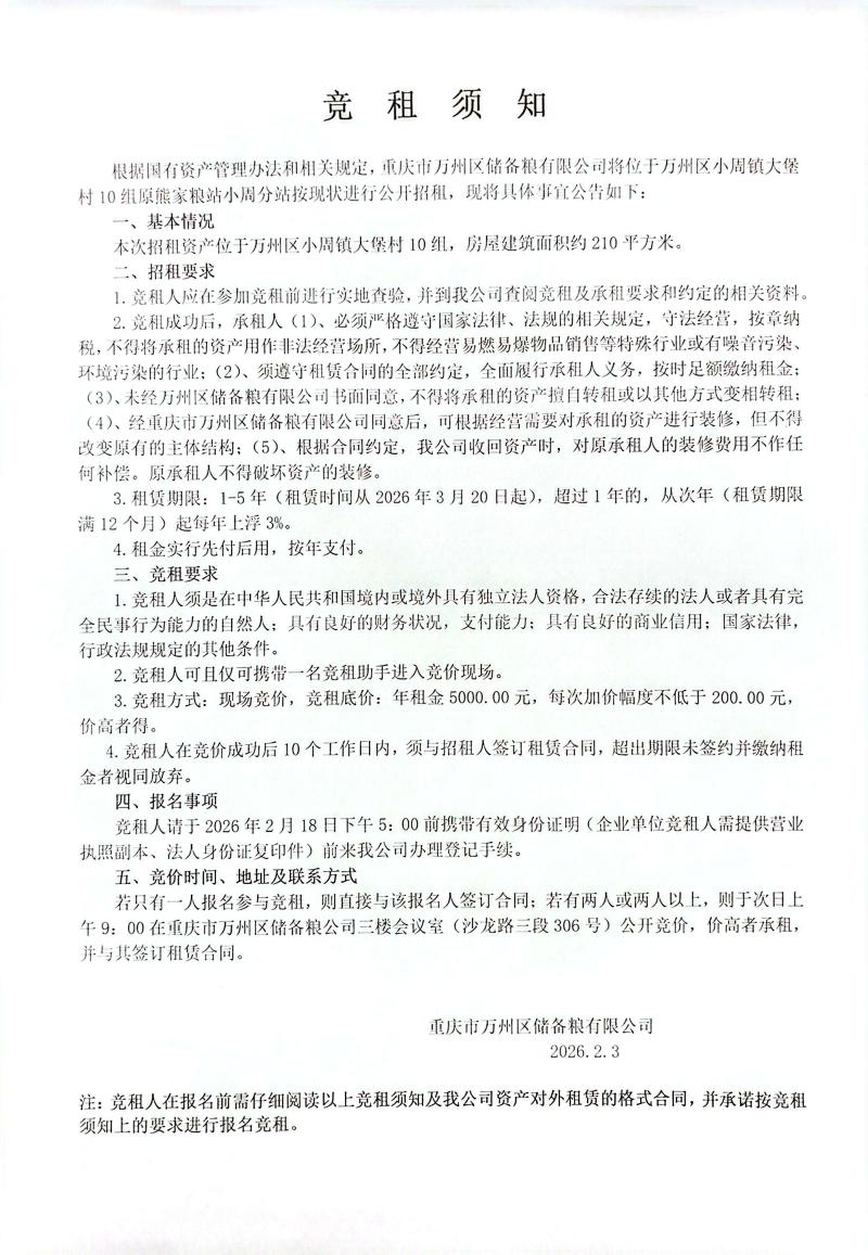 - 万州区储备粮有限公司原熊家粮站小周分站招租
