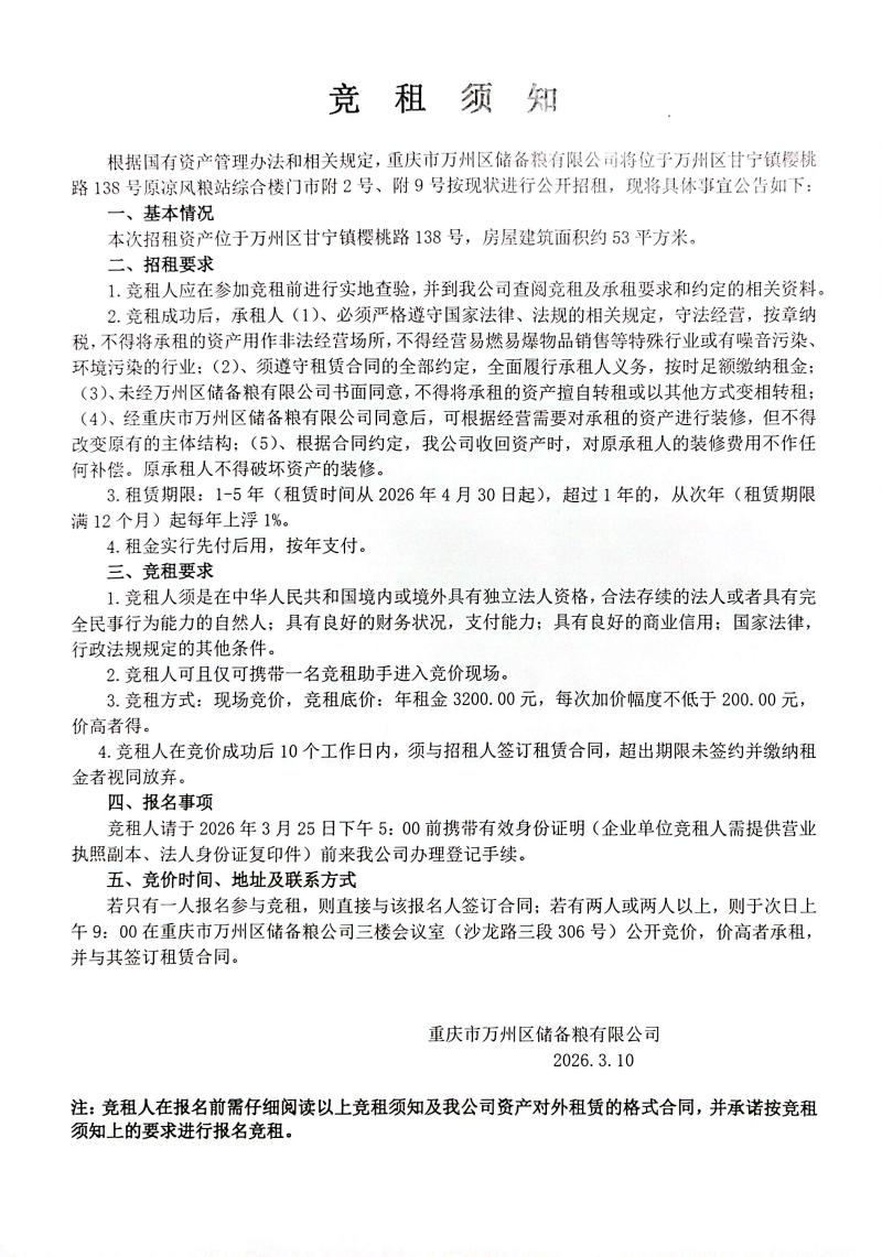 - 万州区储备粮有限公司原凉风粮站龙吟阁分站门面招租
