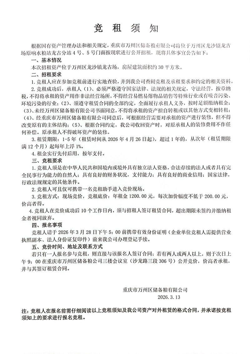 - 万州区储备粮有限公司原凉风粮站龙吟阁分站门面招租