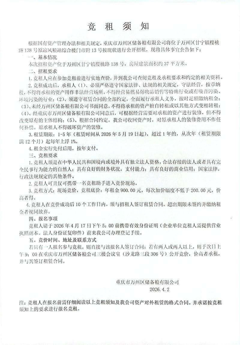 - 万州区储备粮有限公司原凉风粮站龙吟阁分站招租
