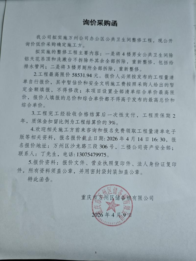 4.欢迎相关施工方前来咨询和报名免费领取工程量清单电子版等相关资料,报名报价截止日期: 2026年4月14日16:30,报名报价地址:万州区沙龙路三段306号,三楼公司资产安全部;来电话时请说是在万州生活网www.cqwanzhou.net看到的!