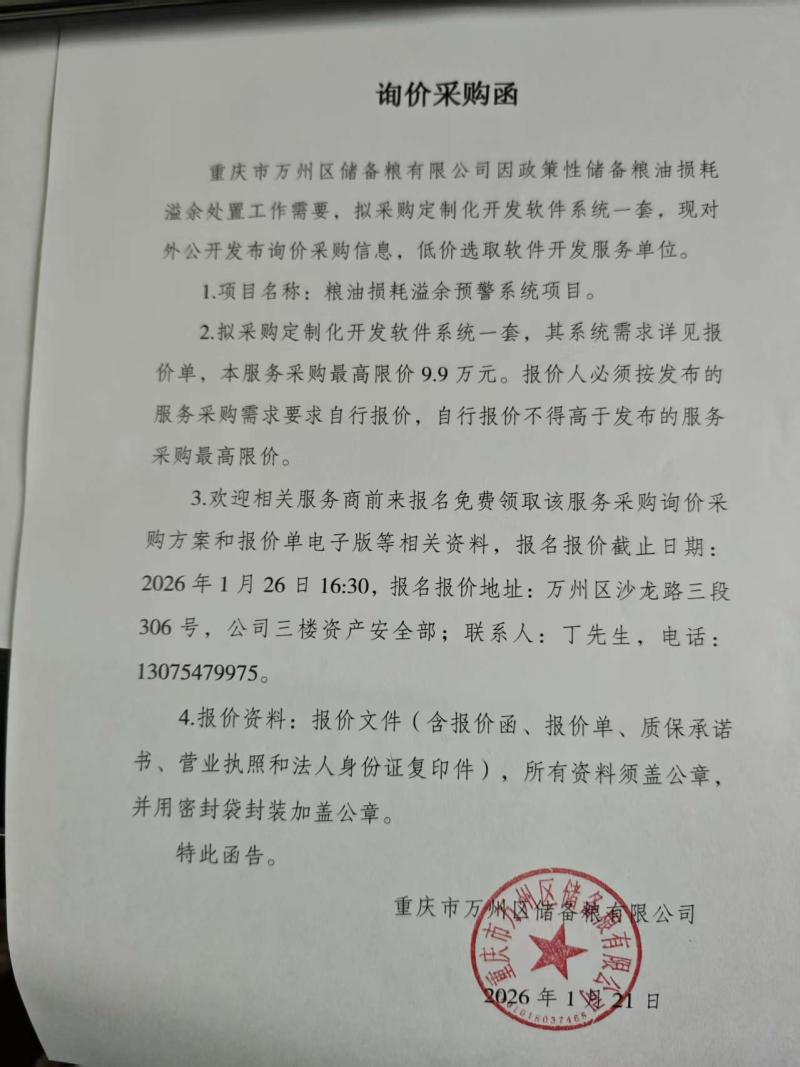 公司因政策性储备粮油损耗溢余处置工作需要,拟采购定制化开发软件系统一套,现对外公开发布询价采购信息,低价选取软件开发服务单位。