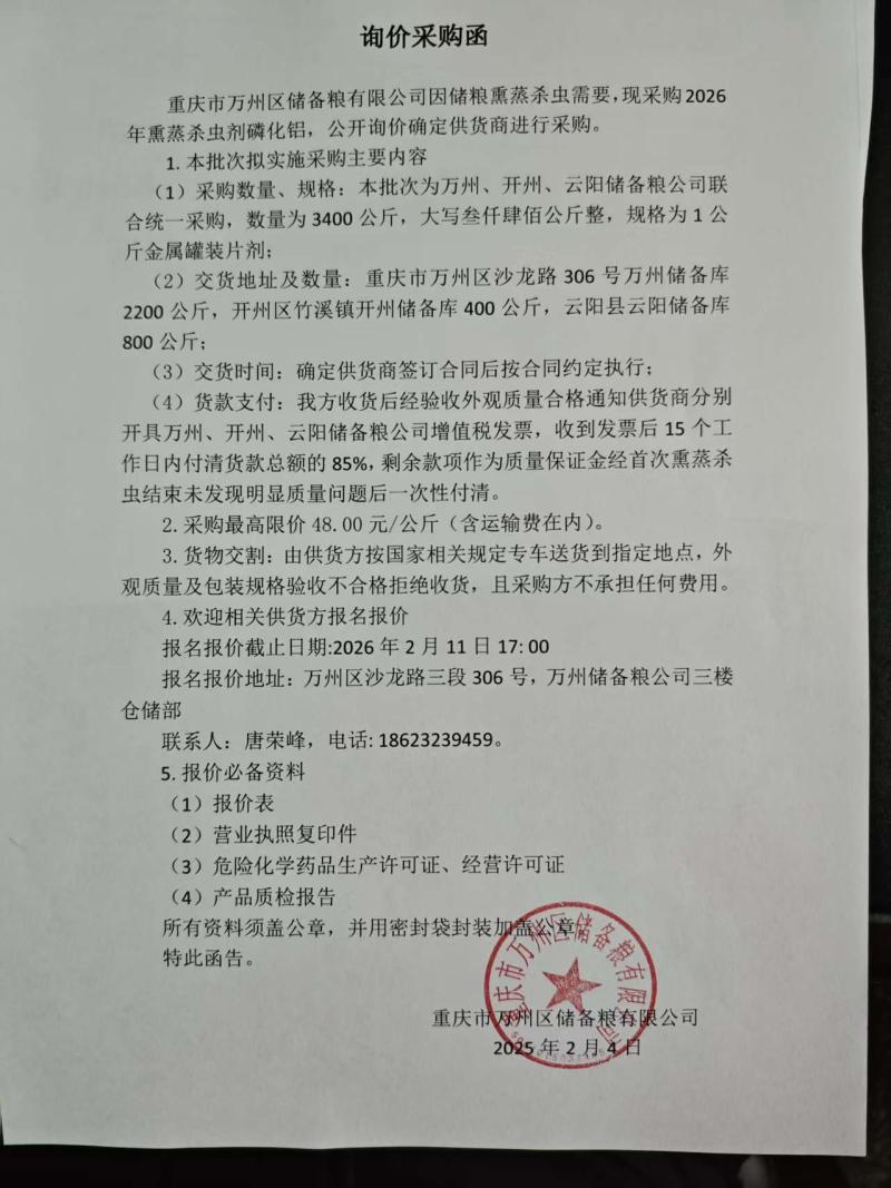 1.因储粮熏蒸杀虫需要,万州、开州、云阳3家储备粮公司拟联合统一采购2026年熏蒸杀虫剂磷化铝,现公开询价确定供货商。