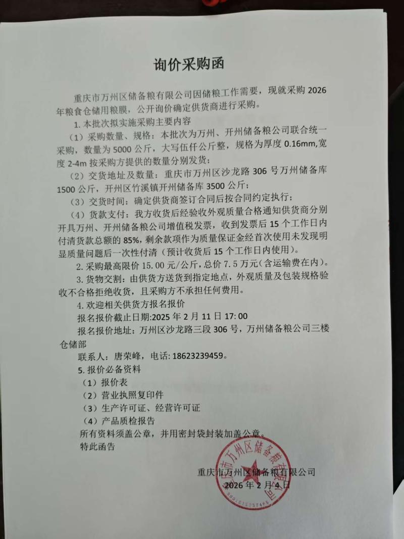 1.因储粮工作需要,万州、开州两公司联合统一采购5000公斤粮食仓储用粮膜,现公开询价确定供货商。