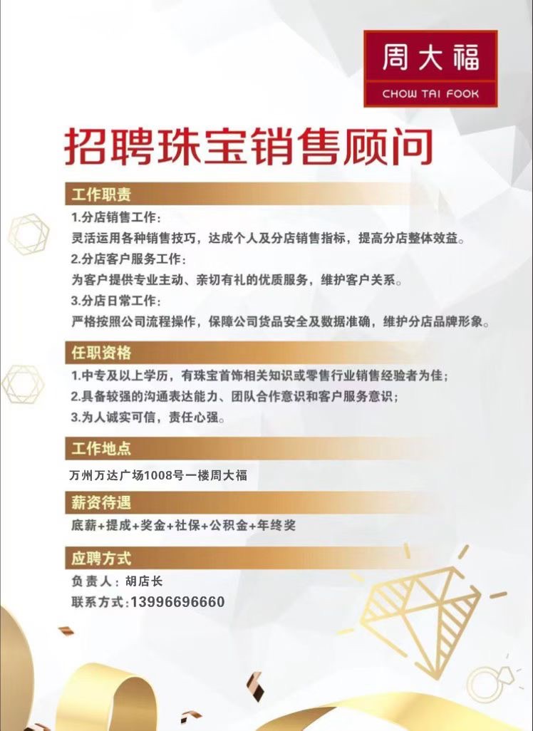 我们猜你可能会对这些信息感兴趣↙- 万达周大福急聘珠宝销售顾问
