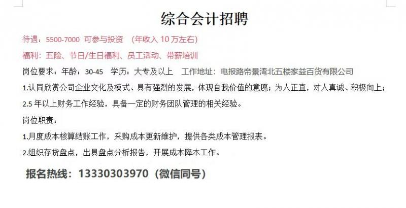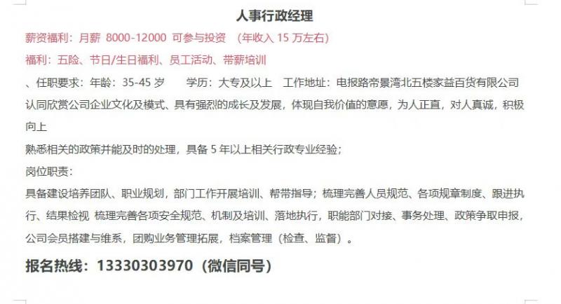 - 家益百货公司(家益超市)急聘会计、人事行政、储干、烘焙、面点