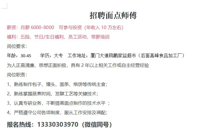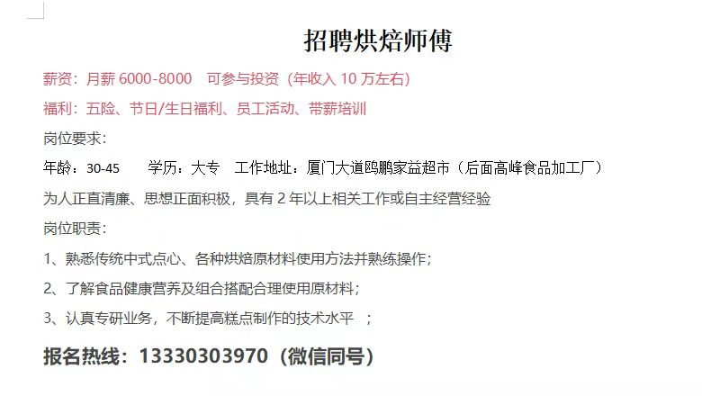 招聘职位:会计、人事行政、储干、烘焙、面点师傅