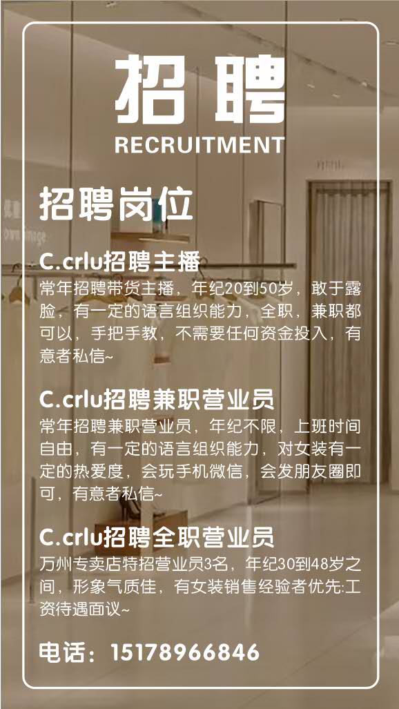 - 万州可路莎C.crlu服装急聘营业员,主播