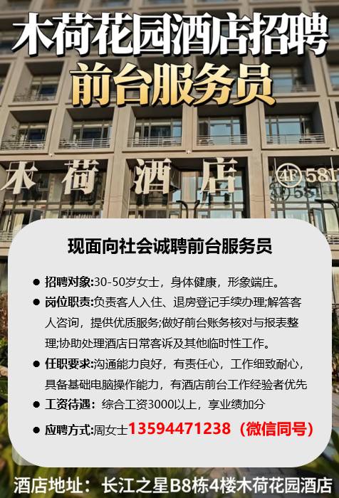 任职要求:沟通能力良好,有责任心,工作细致耐心,具备基础电脑操作能力,有酒店前台工作经验者优先