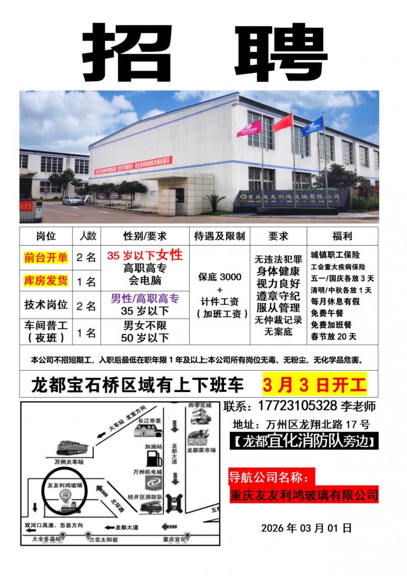 - 重庆友友利鸿玻璃公司急聘前台开单/发货/技术工/钢化夜班